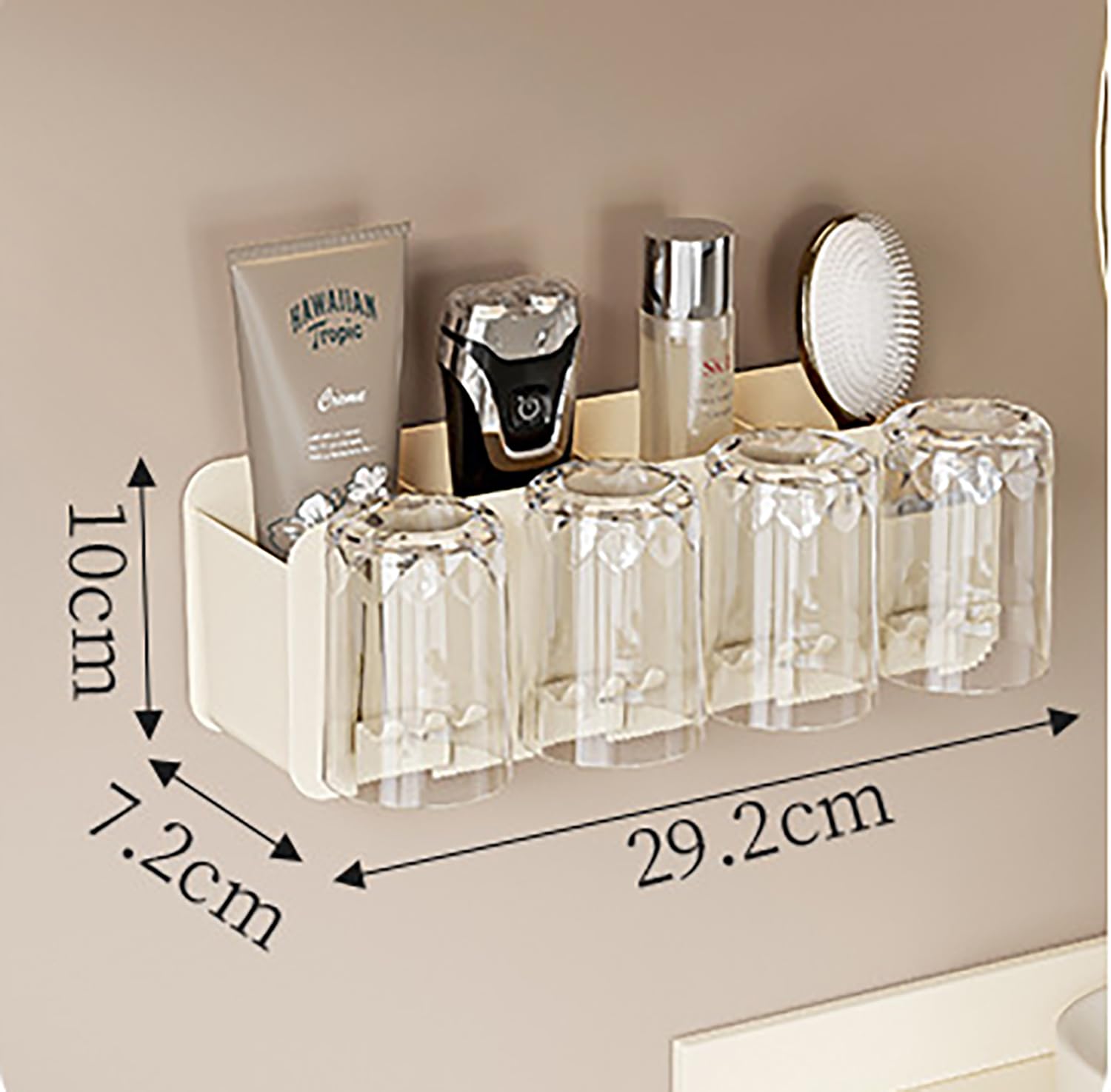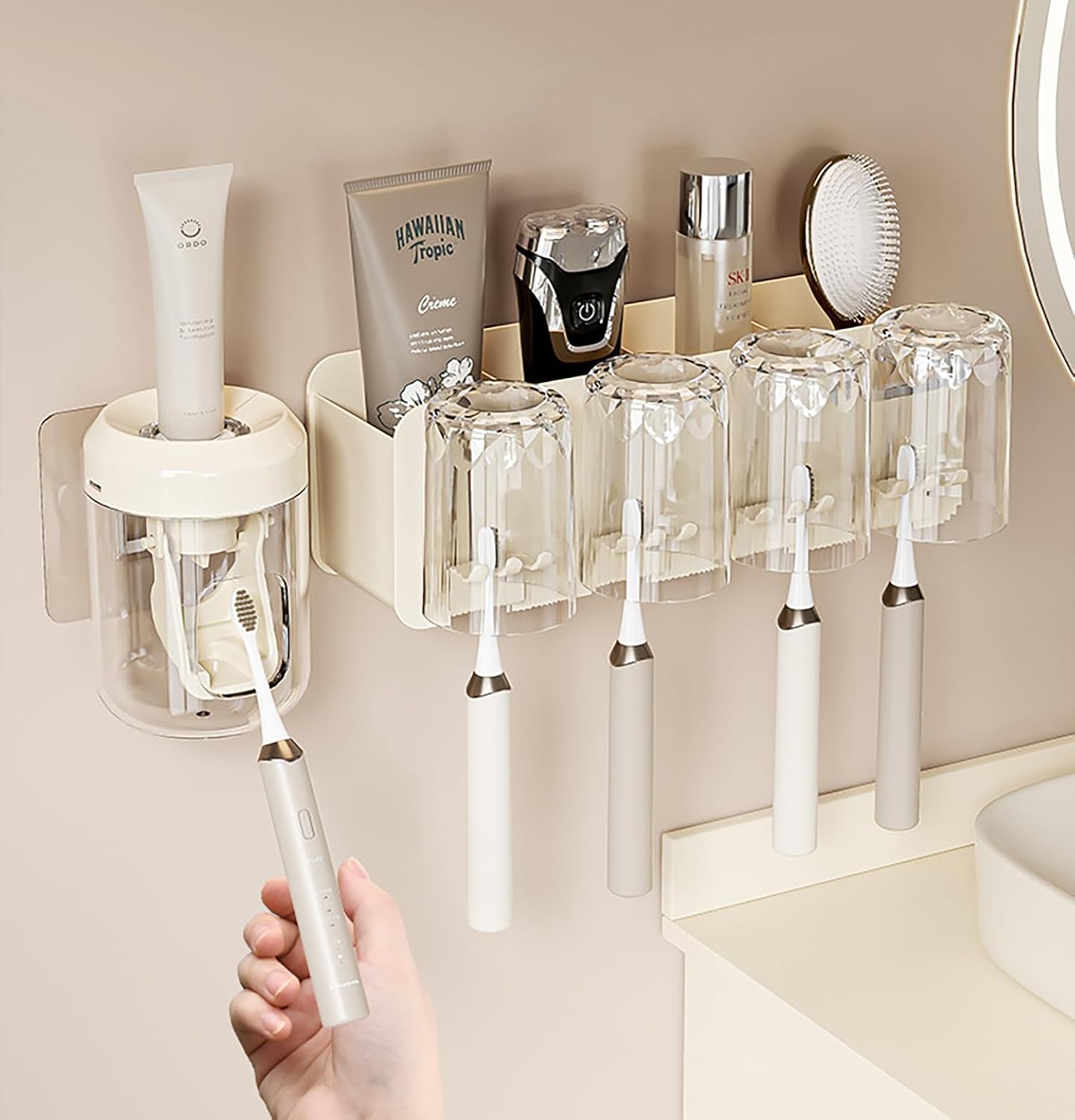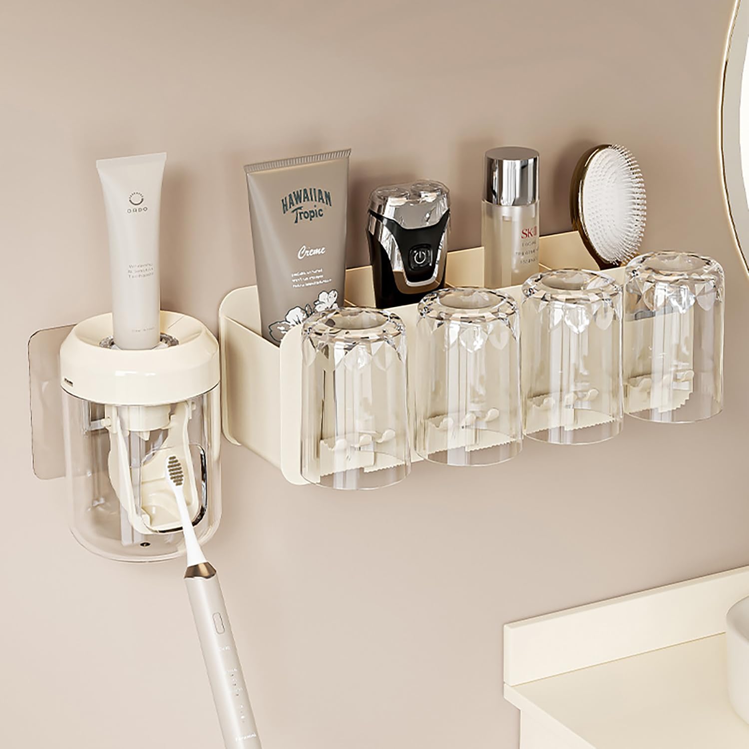 4-Slot Toothbrush Rack, Including 1 Toothpaste Squeezer, 4 Mouthwash Cups (Cream)