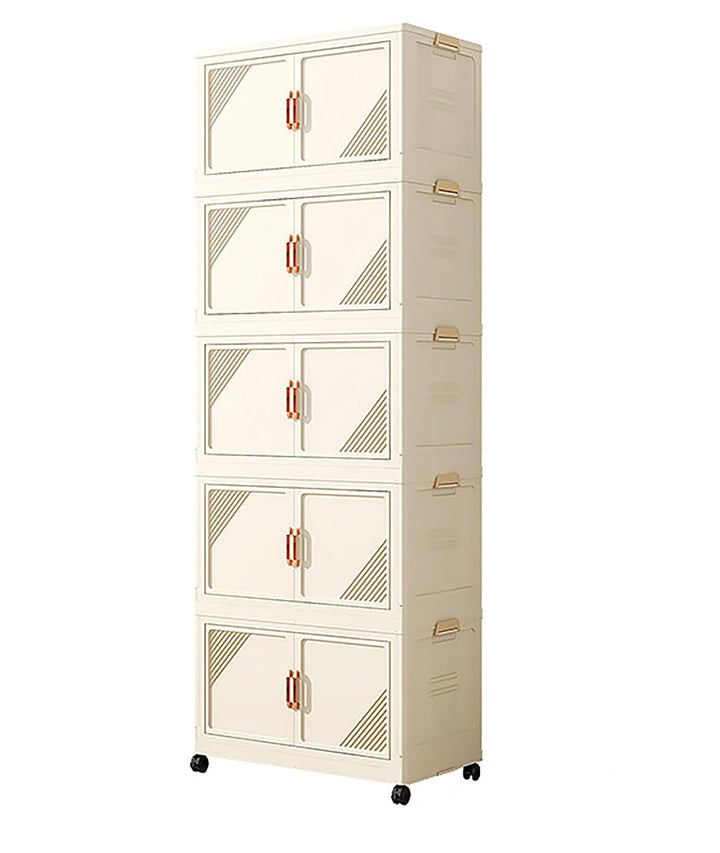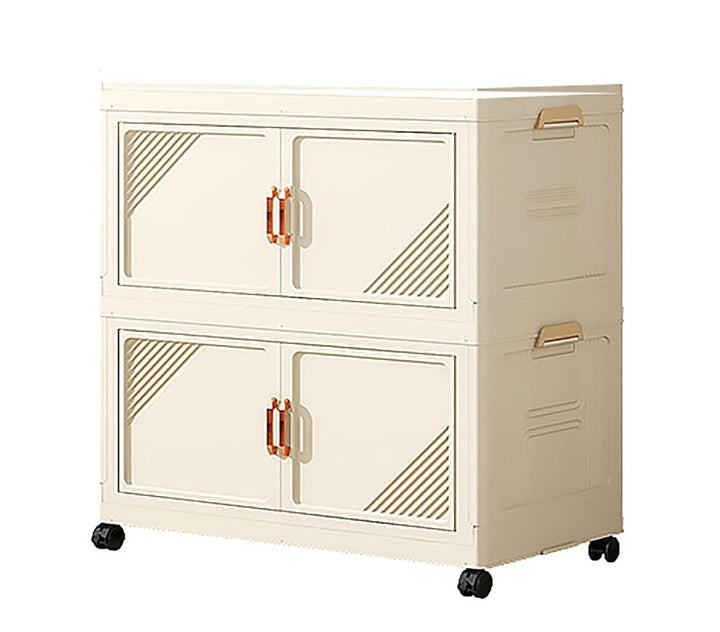 It can stack together steadily to save space. It can storage things in a sufficient way by open the lid, and take out things by open the 2 doors.